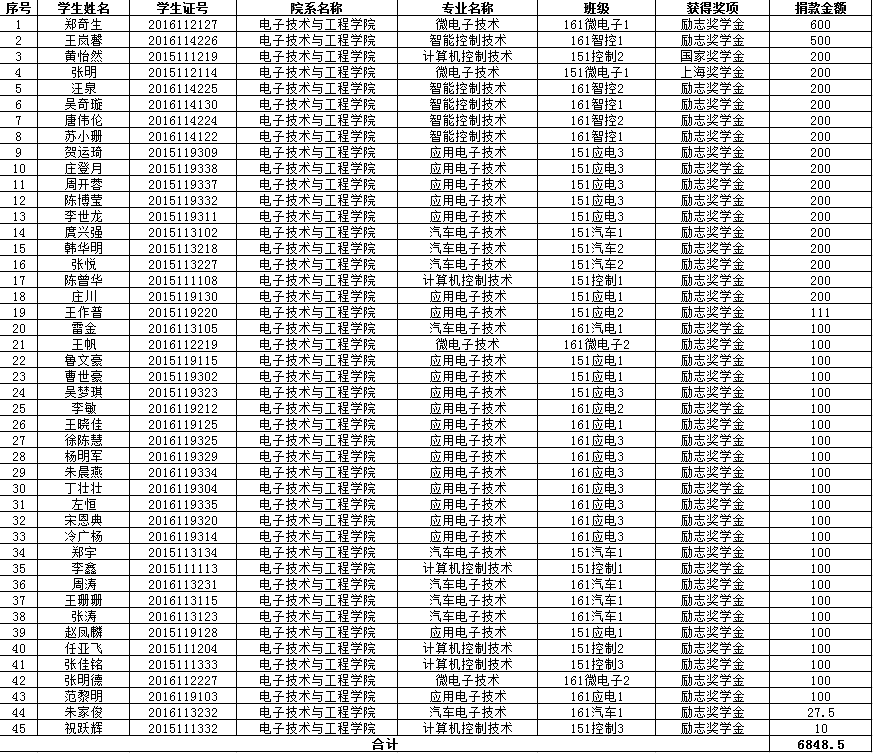 在电子技术与工程学院一年一度的献爱心捐款活动中,荣获2017年国家奖学金、上海市奖学金和励志奖学金的同学们纷纷慷慨解囊踊跃捐款、献出自己的一份爱心。捐款期间共捐得人民币6848.5元整。捐款将如数存入二级学院帮扶基金银行账户内,用于广西瑶族希望小学困难同学和二级学院特困同学的帮扶资助。