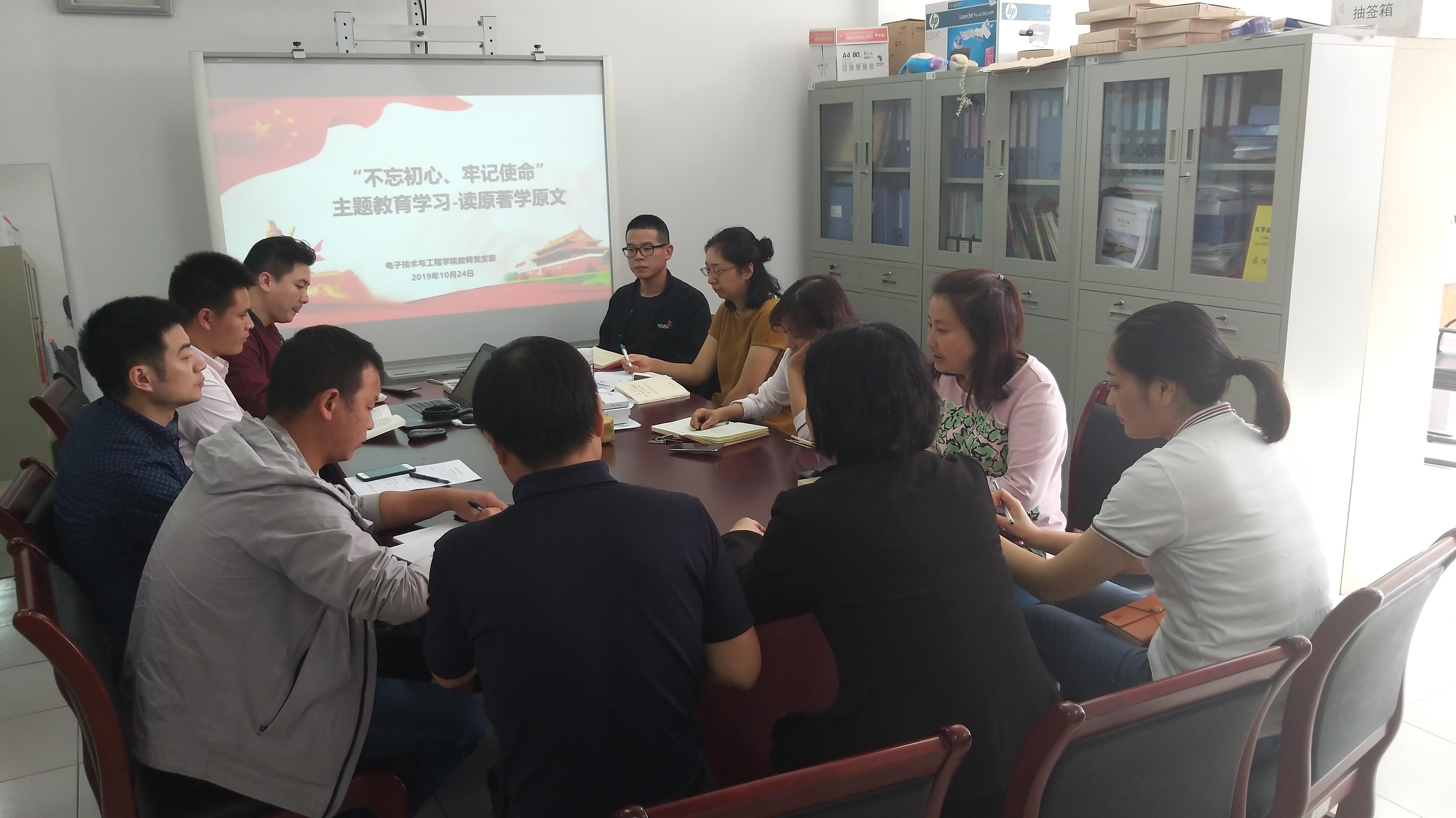 根据学校党委“不忘初心、牢记使命”主题教育总体部署安排,为营造浓厚学习氛围,推动党员干部把学习教育往深里走、往心里走、往实里走,10月24日下午,电子技术与工程学院教师党支部在M311会议室开展“读原著、学原文、悟原理”集中学习活动。学校副校长窦争妍出席,学院党总支书记杨莹、院长邵瑛、教师党支部全体党员参加。会议由党支部书记李军锋主持。