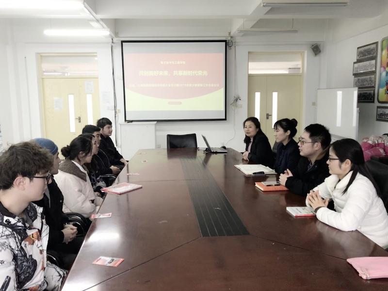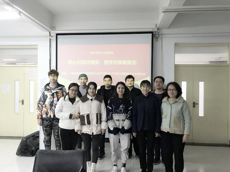 2019年12月18日中午,电子技术与工程学院在N307会议室召开“同心共筑中国梦,携手共享新荣光”民族团结进步总结会议暨全国、上海民族团结表彰大会学习活动。学院党总支书记杨莹,党总支副书记、副院长陈真,学管办主任李翔、辅导员及相关学生出席会议。