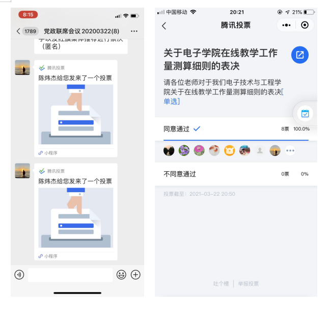2020年注定是不平凡的一年,从年前腊月二十七、八号到现在,2个月的时间里,全国人民在党的领导下打了一场抗疫之战。3月初,学校在上海市教委的统一安排下,进入了新学期,但今年不同于往日,受疫情影响,所有的工作均通过网络进行,教师在家办公、授课,学生在家学习。 那么,怎样保证各项工作能依法依规开展呢?怎样保证学校一直在持续推进的依法治校工作不因为疫情而打折扣呢? 为此,电子学院的党政领导、骨干教师和技术人员一起动脑筋、想办法,通过灵活运用目前市面上所能找到的一些较安全可靠又便捷的在线会议软件、手机APP以及微信小程序等,基本做到了在需要的时候,不同地点的人能互联互通高效交流。 近期,电子学院刚刚开了一场网上的党政联席会议,按照二级学院制订的《党政联席会议制度》要求,应参加人员全部“到场”,对“三重一大”需要表决的事件,采用“腾讯投票”微信小程序等方法,根据决策内容的不同、按照制度规定分别进行实名或匿名投票,确保表决过程严谨规范。 感谢这个伟大的时代,有如此众多的科技手段,使我们在疫情期间虽然不能正常到校上班,但是仍然可以努力做到规范工作不打折。