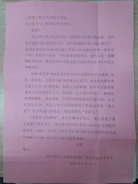 在抗疫期间,191智控1班孔卓雅同学在浦东新区沪东新村街道汇佳苑居民区担任志愿者,负责外来访客登记等社区基层防疫工作。其出色的表现,受到社区党总支的充分肯定。表扬信全文如下:
