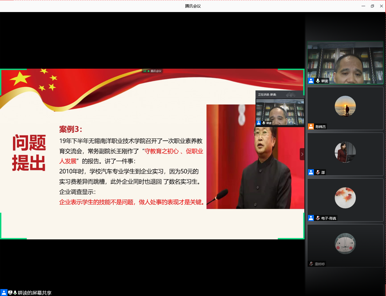 曹建林教授将课程思政在日常工作中的推进和运用细化为“管盯挖化炼引”6字诀和6个“结合”,并围绕如何教书育人、如何在日常教学过程中真正做到为人师表这一主题,以详实的教学案例生动讲述,让我们汲取了同行的智慧,深入了解了课程思政在日常教学活动中的实际运用。