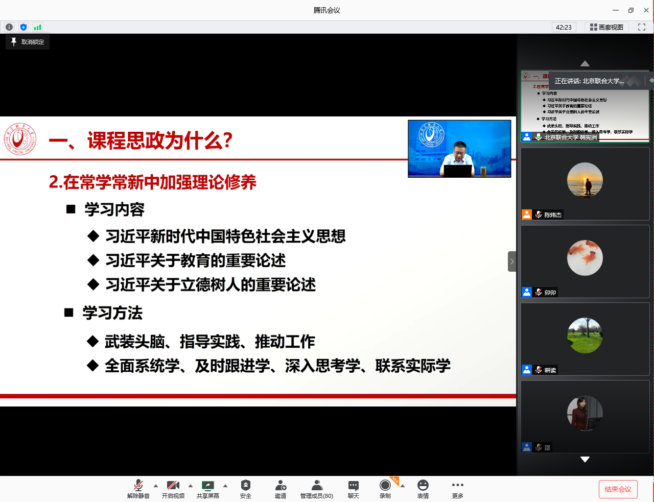 韩宪洲书记以课程思政“为什么、是什么、怎么干、怎么看”四个方面为主要内容,为我们讲授了课程思政提出的时代背景、核心内涵,并以北京联合大学在课程思政推进过程中的具体做法为例,介绍了深化教育体制改革,健全立德树人机制的落实方法。