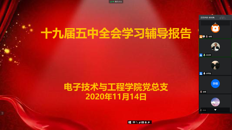 为深入学习宣传贯彻十九届五中全会精神,2020年11月14日上午电子技术与工程学院党总支利用腾讯会议形式,邀请上海立信会计金融学院徐光寿教授进行十九届五中全会精神辅导讲座。会议由党总支副书记李军锋主持。学院全体党员参加会议。