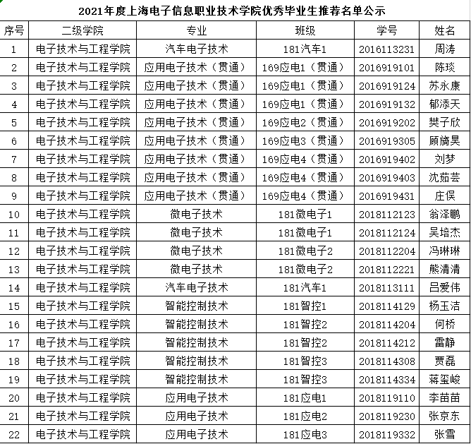根据学校学生资助管理中心发布的《关于开展2021年度学校优秀毕业生评选工作的通知》要求,电子技术与工程学院本着公开、公正、公平原则,经学生本人自主提交申请表和推荐表,辅导员组织班级群评议,二级学院综合评审并经过党政联席会议表决,现推荐申报学校优秀毕业生22人。现将推荐申报名单予以公示,公示期自2021年3月23日至2021年3月31日。