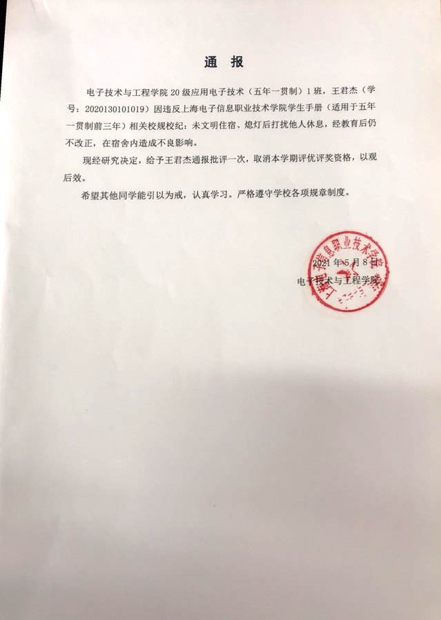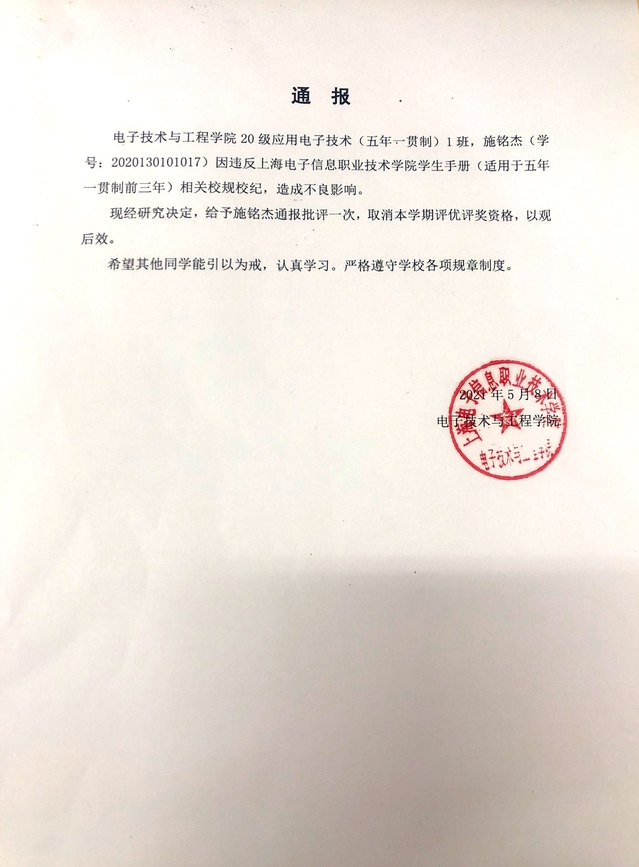 关于给予施铭杰、王君杰2位同学学院通报批评的处理意见
