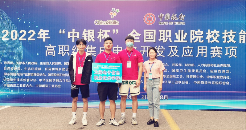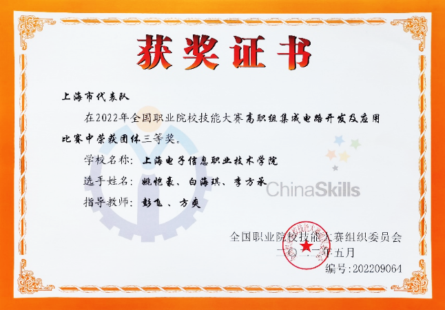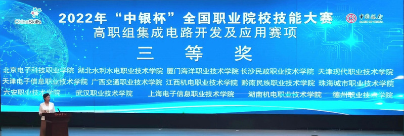 8月30日至31日,2022年全国职业院校技能大赛(高职组)“集成电路开发及应用赛项”在山东省滨州职业技术学院圆满落幕。2020级集成电路技术专业学生白海琪、李方承和2020级微电子技术专业学生姚凯豪在电子技术与工程学院教师李军锋(领队),彭飞、方爽(指导教师)的指导下代表上海队参加了本次比赛,经过2天10个小时的激烈角逐,团队荣获全国三等奖。