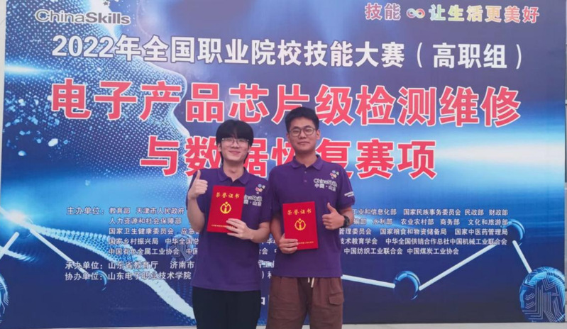 2022年全国职业院校技能大赛(高职组)电子产品芯片级检测维修与数据恢复赛项比赛8月23-25日在山东电子职业技术学院举行,我校由电子技术与工程学院邓海平、徐御老师指导的参赛队从50支队伍中脱颖而出获得三等奖。