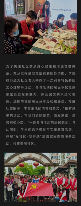 5月26日,上海徐汇官方公众号报道我院联建共建活动。学院将继续在学校指导下,发挥党建引领,主动积极探索大学生志愿服务进社区,创新大学生劳动实践方式、内容,带领、鼓励青年学生积极劳动,深入基层、服务基层,增长社会阅历,绽放青春光彩。