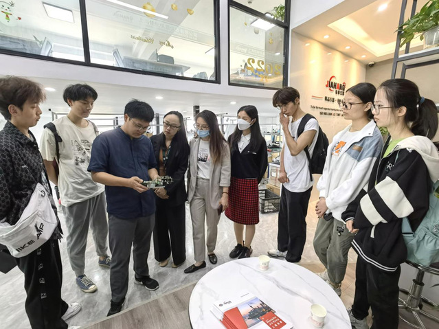 随后,翁飞印带领大家参观了公司的生产车间和研发中心,学生们对生产环节及技术特点进行了逐一了解。翁总对实验室中的全自动熔点仪等公司主要产品设备进行了详细功能介绍,与同学们互动。