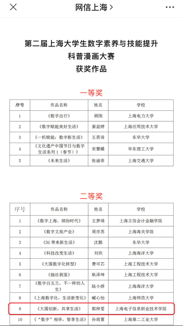 近日,由市教卫工作党委、市教委,团市委的指导,上海教育系统网络文化发展研究中心组织开展的“第一届上海中小学生数字素养与技能提升科普漫画大赛”和“第二届上海大学生数字素养与技能提升科普漫画大赛”的遴选结果正在公示。我院22集成1班的郭梓莹同学设计的作品《大国创新,共享生活》荣获大赛二等奖,也是全市唯一一所高职院校获奖作品。