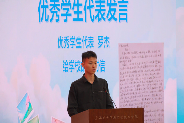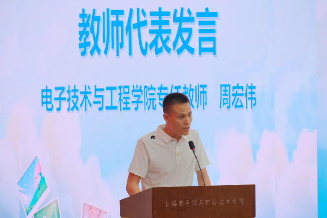 浓浓不舍意,暖暖师生情。教师代表周宏伟老师发言,他谈到,民族伟大复兴不是口号喊出来的,是靠每一位中华儿女的双手共同创造出来的,每一位同学就是中国未来的核心力量,也是上海电子信息职业技术学院的一面旗帜,希望这面旗子无论在哪里都能发光发热,照亮祖国的大地。作为陪伴同学们大学三年的良师、益友,辅导员代表秦婧老师在会上发言,她很开心陪伴大家度过一段美好的青春岁月,见证大家的成长和收获,希望同学们眼里有光芒,心中有梦想;胸中有丘壑,以行践知;勇敢且善良,真诚赤子心。最后,学院的党政领导、教师、辅导员们通过视频的方式送上了自己最真挚的祝福,希望同学们牢记“尚德修能、知行合一”的校训,在新征程上踔厉奋发、勇毅前行、前程似锦、未来可期。