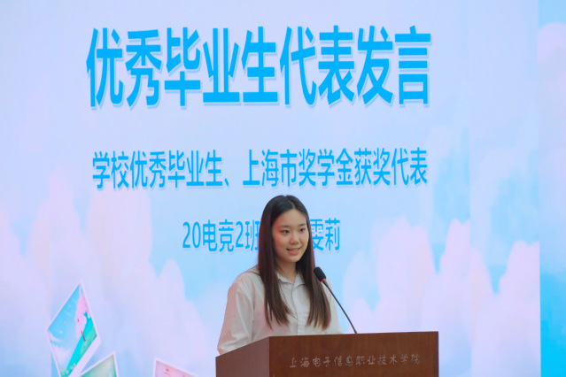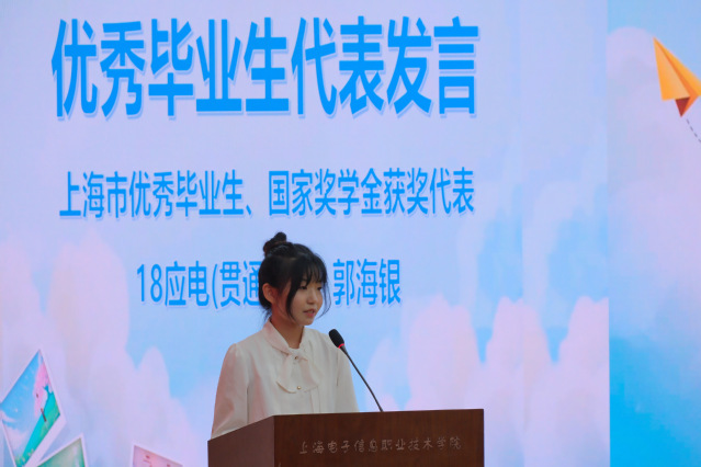 青春不散场,扬帆新启航。上海市优秀毕业生、国家奖学金获奖代表郭海银和学校优秀毕业生、上海市奖学金获奖代表吴雯莉作为毕业生代表发言。他们表示,在以后的学习、工作、生活中,将坚持知识与实践并重,学识与技能相长,在新的起点上心怀从零开始的勇气,永葆求知探索的初心,在未来的人生中为梦想披荆斩棘,奋力奔跑,努力成为可堪大用,能担重任的栋梁之才。