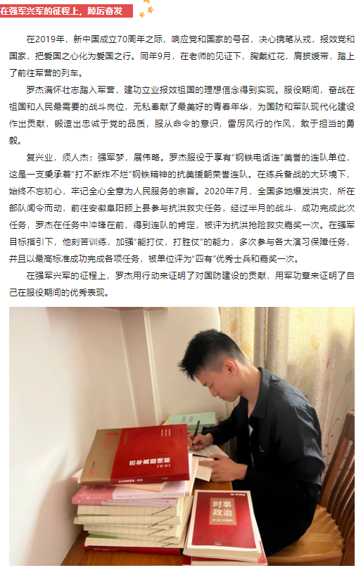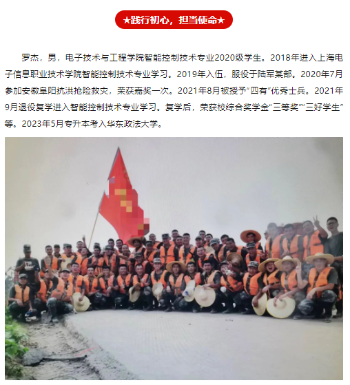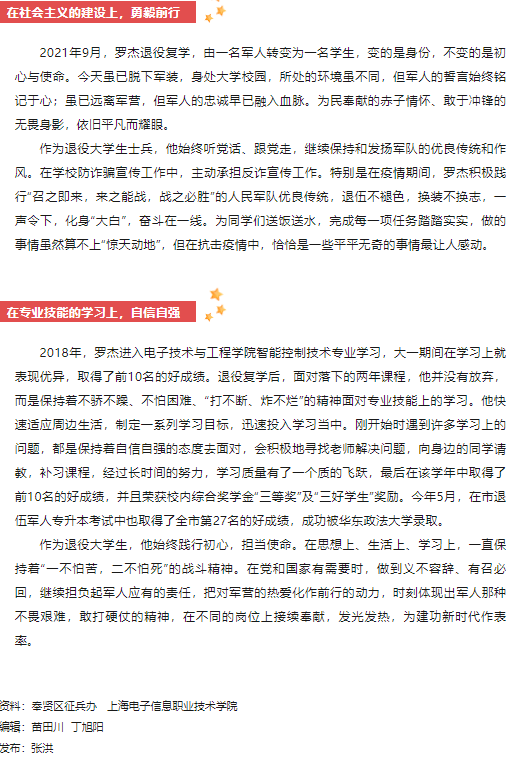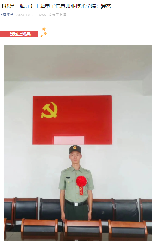 上海征兵网报道我院智能控制技术专业2020级学生罗杰的先进事迹。