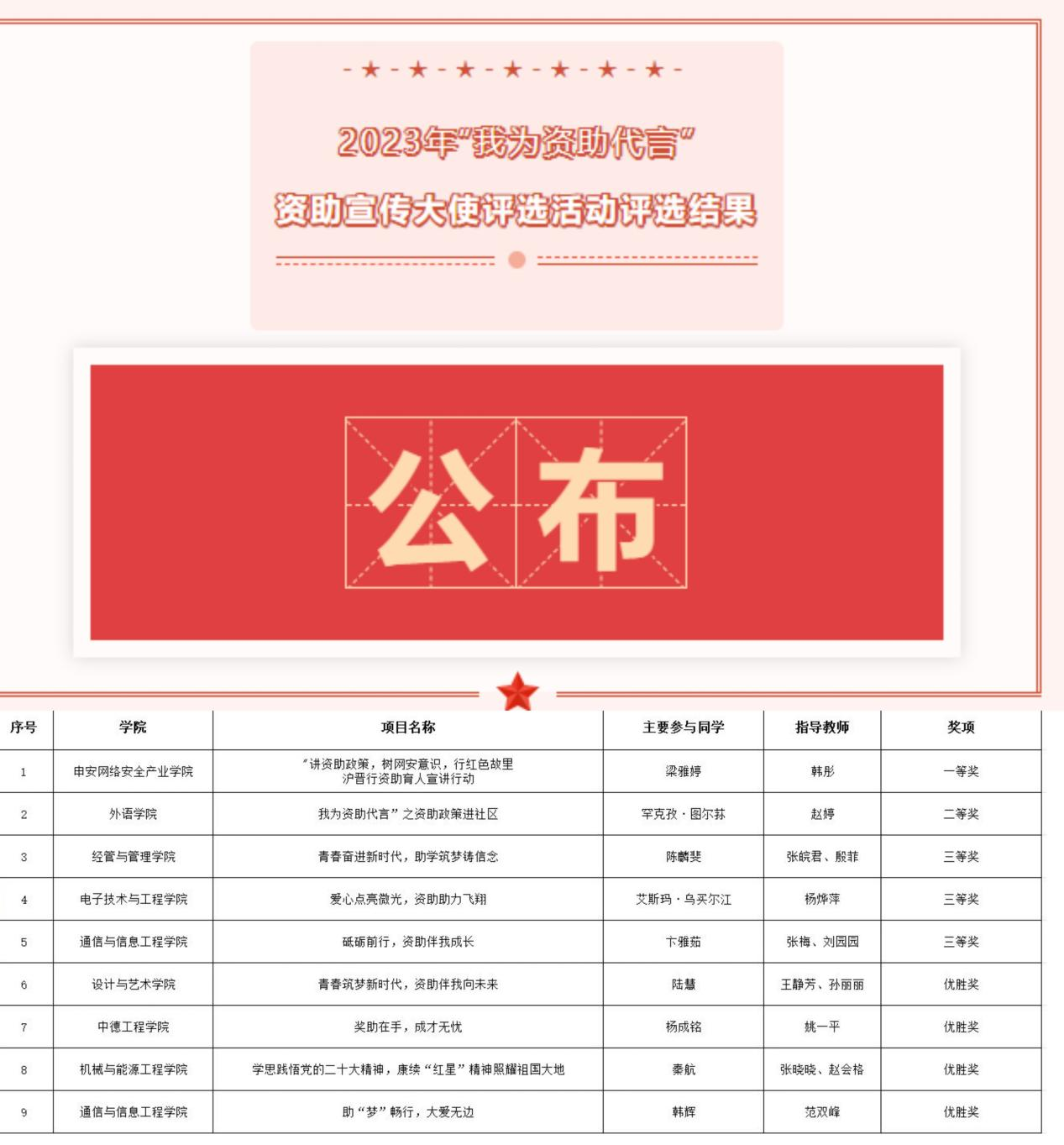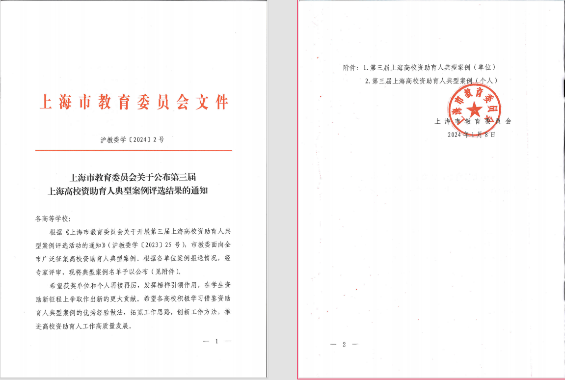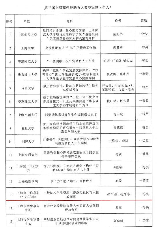 近日,上海市教育委员会发文公布第三届上海高校资助育人典型案例评审结果,全市高校范围内共评选出典型案例(单位)23项、典型案例(个人)94项,其中个人案例一等奖15项、二等奖20项、三等奖25项。我院《二级院校学生资助工作虚拟社区育人模式探索》(作者:张军丽、杨烨萍)荣获典型案例(个人)一等奖,也是荣获一等奖高校中唯一一所高职院校。