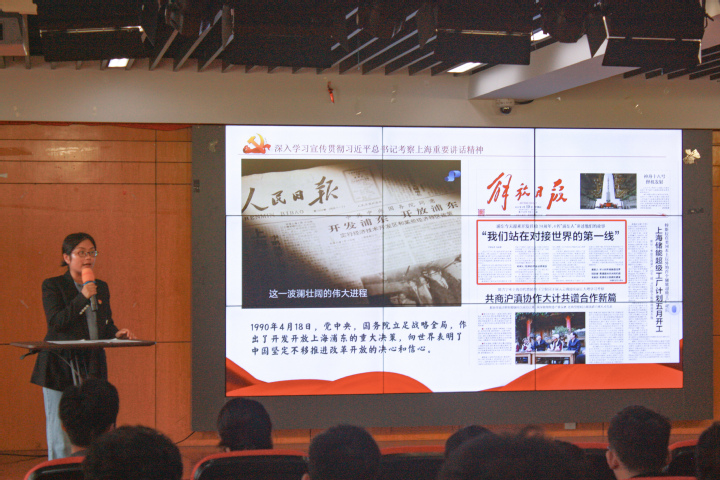 在党课宣讲过程中,秦婧老师详细解读了习近平总书记在上海考察时强调的三个关键:上海要聚焦建设“五个中心”的重要使命,要以科技创新为引领,加强关键核心技术攻关,推进高水平人才高地建设,营造良好创新生态;要在推进中国式现代化中发挥龙头带动和示范引领的“两个作用”,在科技、教育、人才的战略支撑方面当好龙头;要把握高度和温度“两个维度”,全面践行人民城市理念,努力走出一条中国特色超大城市治理现代化的新路。她将如何实现中国式现代化与习近平总书记考察上海重要讲话精神相结合,以生动的语言,大量的史料与现实案例,带来了一堂让大家听得懂、愿意听,感同身受、产生共鸣的主题党课。最后,秦婧老师呼吁在场师生深刻领悟习近平总书记为上海发展所指明的政治站位、总体定位以及实践落位,勇担使命,在上海奋进新征程、建功新时代的过程中不断创造新的作为。
