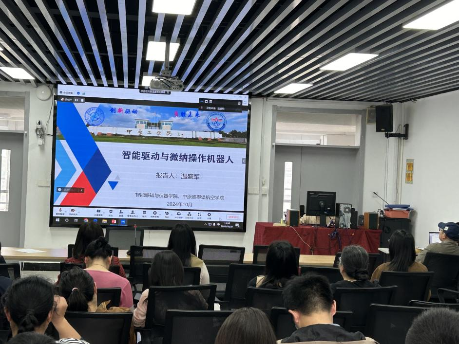 讲座由中原工学院智能感知与仪器学院(中原彼得堡航空学院)执行院长、河南省先进控制与新能源科技国际联合实验室负责人、河南省青年科技奖获得者温盛军教授主讲。温教授首先介绍了微纳机器人的基本概念和分类,指出微纳机器人是微纳米技术的集大成者,是机器人技术在微观尺度的延伸,融合了物理、化学、材料学、生物学、机械学、信息学、控制学等多学科前沿研究。