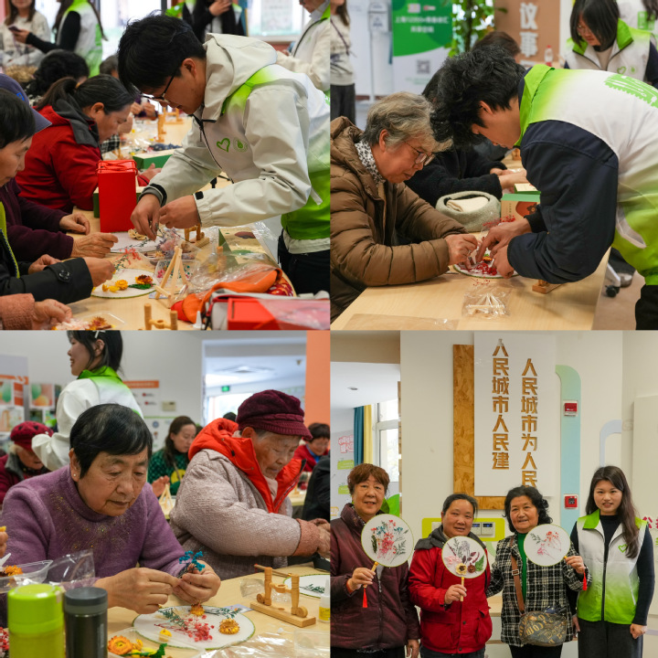 在非遗手工团扇制作环节,师生志愿者们耐心陪伴、指导老人们共同体验非遗团扇制作。从精心挑选干花,到巧妙设计图案,再到细致粘贴,老人们全神贯注,沉浸其中。每一把团扇都承载着老人们的创意与情感,充分展现了他们对美的不懈追求和对传统文化的深深热爱。通过这一活动,老人们不仅深刻领略了非遗团扇的独特魅力,更增强了对中华优秀传统文化的认同感和自豪感,精神文化生活得到了进一步的丰富和提升。