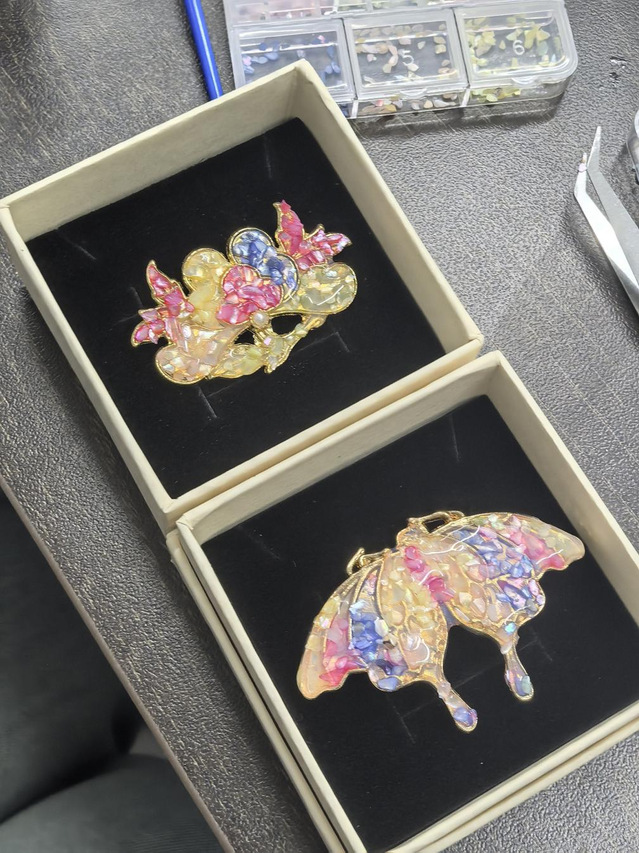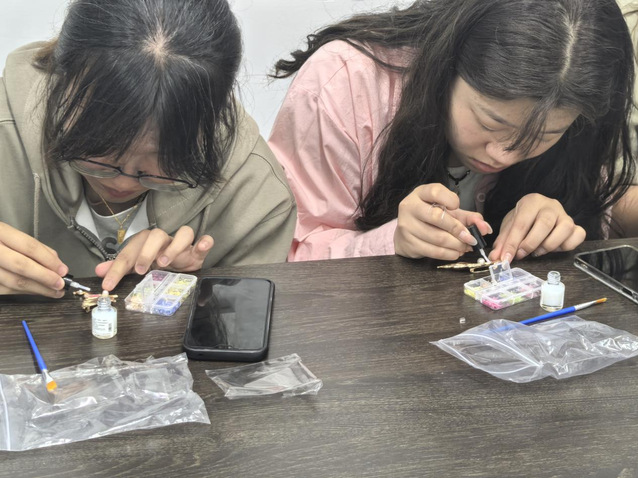 活动伊始,易班工作站站长通过生动的图文展示和细致的讲解,向同学们介绍了螺钿工艺的历史渊源、制作要点与艺术特色。随后,为每位参与者发放精心准备的材料包,从色彩斑斓的螺壳碎片到精致的胸针底托,每一份材料都承载着对传统文化传承的期待。在动手制作环节,同学们充分发挥想象力与创造力,根据自己的审美和构思,将螺壳碎片巧妙切割、拼接、镶嵌。现场气氛热烈而专注,大家时而低头专注创作,时而相互交流灵感,在色彩搭配与图案设计中,一件件独具匠心的螺钿胸针逐渐成型。