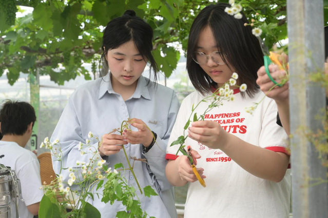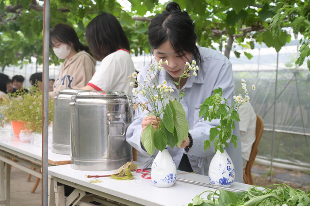 中午时分,活动进入温馨的“生活之美”环节。同学们分组围坐在餐桌旁,用采摘的野花开展插花活动。在芬芳的花香中,大家尽情发挥创意,将手中的花材巧妙搭配,原本普通的花材在同学们的巧手下,摇身一变成为一件件独具匠心、美轮美奂的艺术作品。每一朵花、每一片叶都承载着同学们对生活的热爱与对美的追求。