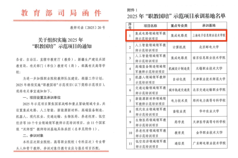 近期,我校成功获批2025年“职教国培”示范项目,申报的“集成电路领域领军教师示范培训项目”在140余家单位中脱颖而出,经专家打分评审,最终成为11个入选项目之一,也是唯一入选的集成电路领域项目。