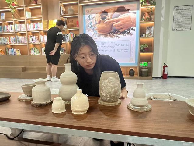 在庐江传统陶艺工坊,宣传大使与当地青少年一同体验泥土在指尖的奇妙蜕变。揉捏、塑形、上釉......传统匠人的坚守与智慧令人动容。队员在体验中感悟到:“资助育人,如同制陶,既需精准‘塑形’——政策支持学业发展,也需文化‘上釉’——涵养心灵底蕴,方能成就坚韧而璀璨的生命之器。”