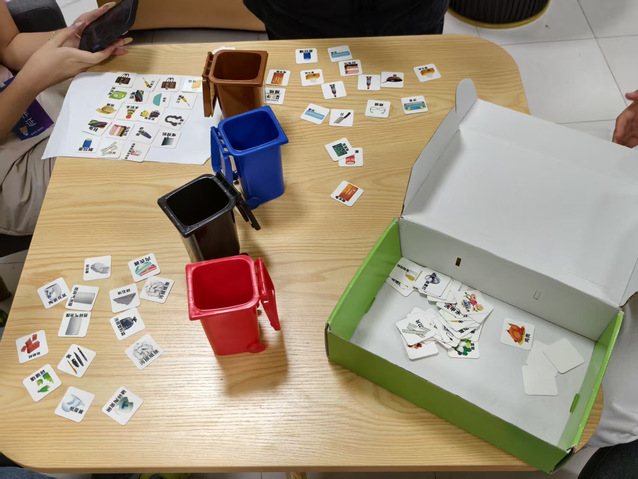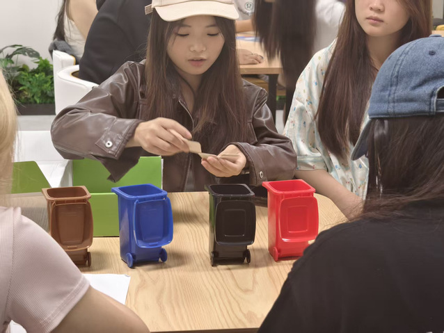 活动现场以柔黄灯带与薰衣草香氛营造舒缓氛围,为参与者打造沉浸式体验空间。核心环节“分类竞速赛”中,180件模拟垃圾道具(涵盖旧试卷、灯管、奶茶杯等生活常见物品)被随机铺展,两组选手需在2分钟内完成精准分类,成绩由正确率与用时双重评定。随着计时器启动,参赛队员迅速进入状态:有人单膝跪地细致甄别道具属性,有人以“秒投”动作完成分类投递,更有同学围绕“尼龙袋回收属性”展开轻声研讨,在协作中深化分类认知。过程中,误投场景触发的互助提醒与竞技节奏交织,形成紧张而活泼的互动氛围。最终,第二组以1分32秒、96%正确率的表现斩获优胜,现场响起热烈掌声。